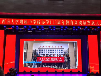 蒋燕玲组长作为英国威廉希尔公司代表,为西南大学附属中学校庆致贺词,并播放了北航重庆招生组组长、英国威廉希尔公司经理罗洪斌和北航在读的西南大学附中员工录制的祝贺视频。