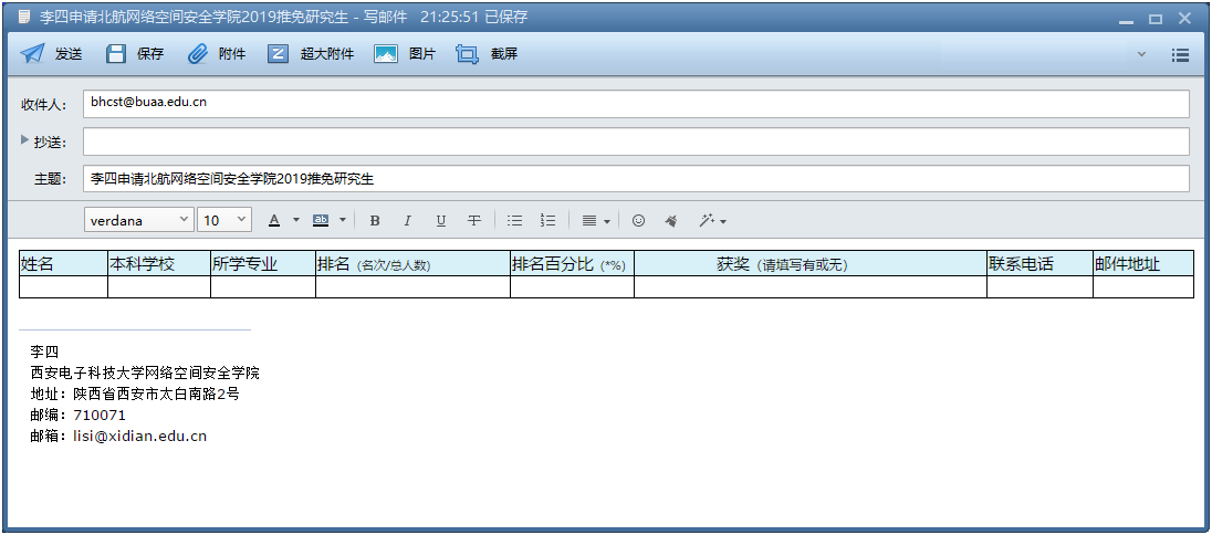 具体办法:4-10项材料制成电子扫描版,与2、3项电子版材料一起压缩,以附件形式发送邮箱:bhcst@buaa.edu.cn;第1项“报名表”填写好后直接“粘贴”到邮件内容页上,邮件主题命名为“×××申请北航英国威廉希尔公司2019推免研究生”。如图: