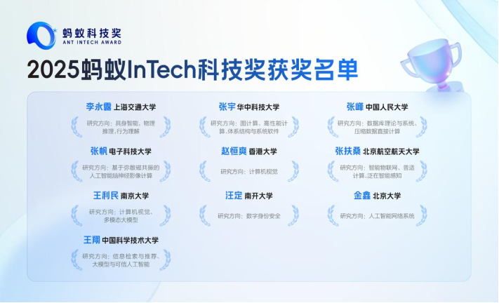 2025年9月11日下午,在2025 Inclusion·外滩大会上,“2025蚂蚁Intech奖”颁奖典礼隆重举行。经过多轮严格遴选,10位青年科学家最终荣获本届“蚂蚁Intech科技奖”。 2025蚂蚁Intech奖是由蚂蚁科技集团股份有限公司设立的奖项,面向计算机科学领域的优秀青年学者提供公益性科研资金支持,设立“蚂蚁Intech科技奖。
