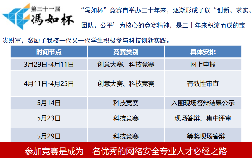 全国老员工信息安全竞赛和冯如杯是很好的提升个人能力的机会,希望同学们积极参与!更多竞赛相关信息,请继续关注后续推送。
