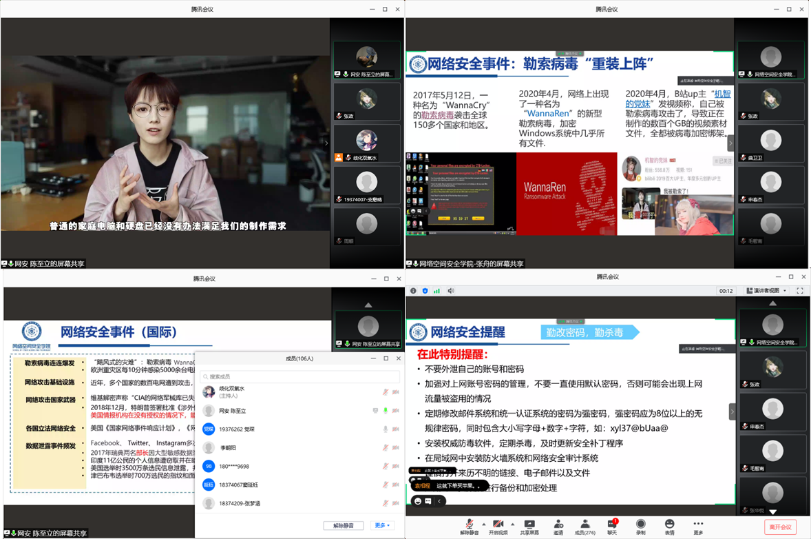 本周三下午四时,网安宣讲团为材料学院本科生、研究生开展网络空间安全知识宣讲,本次宣讲活动在线上进行。宣讲团成员陈至立和张舟分别为本科生、研究生宣讲,本科生到场111人,研究生到场301人。